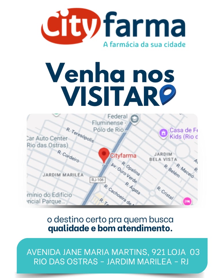 Razão Social: E C FARIA RANGEL E DROGARIA LTDA | Nome de Fantasia: DROGARIA Cityfarma CNPJ: 07.978.622/0001-38 | I.E. 78.103.01-9 Avenida Jane Maria Martins Figueira, 921 - Loja: 3 Jardim Marilea | Rio das Ostras | CEP 28896-013.